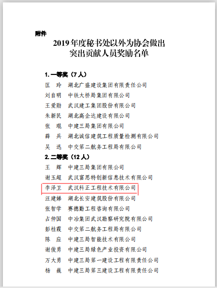祝賀公司總經理李澤衛同志榮獲武漢建筑業協會2019年度秘書處以外為協會做出突出貢獻人員二等獎!