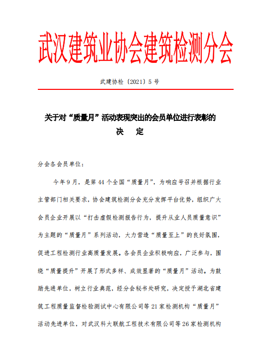 感謝武漢建筑業(yè)協(xié)會(huì)建筑檢測(cè)分會(huì)為檢測(cè)單位提供提高檢測(cè)質(zhì)量、展現(xiàn)風(fēng)采的平臺(tái)!感謝科正人的不懈努力!