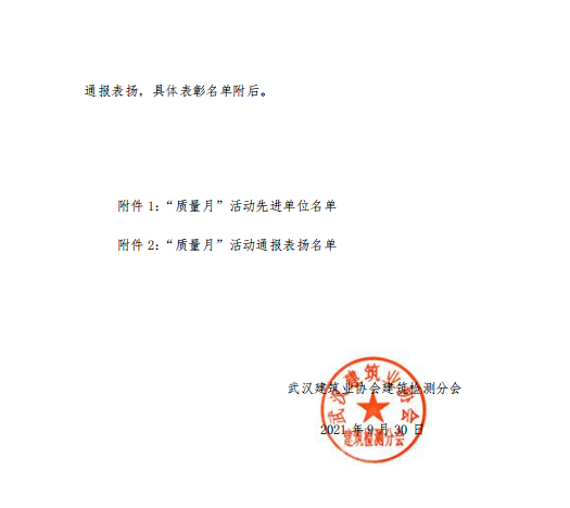 熱烈祝賀武漢科正工程技術(shù)有限公司在2021年9月"質(zhì)量月"活動(dòng)中獲得先進(jìn)單位的榮譽(yù)!